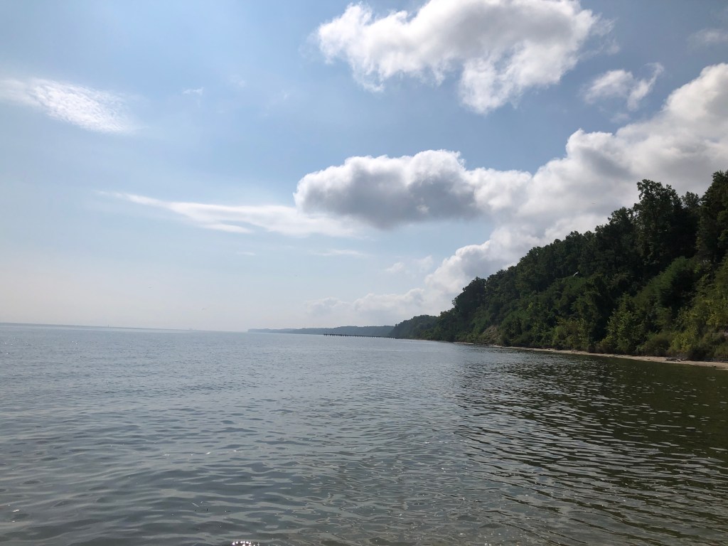 and so there I was, another year, another week, my fortress of solitude, or at least a rental for a time, a log cabin up on Calvert cliffs, overlooking the Chesapeake bay, I come here on vacation once a year, I wind up contemplating life, and death, no, not a suicide thing, I have never had thoughts like that (thankfully), just looking down at my pile of chips and seeing where I am in the game, this is not reality, heck, it is escapism at it’s best (or worst), I suppose it is easy to take the yoke off, work, family, the daily routine I fall into, immediately I am relieved, within a day, just walking along the beach, my preoccupation of looking for, fossils in the surf (as this place is known for), perhaps just a metaphor, as I wander looking for perfect pieces of my past washed up on the ‘beach’, walking with no direction, no time slot, no time schedule, no idea of time unless I care to look at my phone, the cliffs block the sun in a way that shadows roam and invade nearly at half a day, and the beach, in most parts is dark by two in the afternoon, while the residents are out and about with work and life, and there I wander, no destination except not being able to walk further, the broken shells rip at my feet, so I put on my water shoes, then they rub my ankle damn raw so I take them off, barefoot again, sinking into the shore, the usual chatter of a busy subway platform in my mind subsides, washed away by every lap of tide, even on days when the water was a mirror, still the soft heart beat slight roar as the waves sink into the shore, at times I just stare at the water, or the birds, cormorants preening, their black shadows standing out against the water, and the gulls, their stark white standing out against the bluest of sky, even the occasional clouds can not ruin this scene, a Chesapeake scene painted on the fly just for me, as no where else in the world is anyone else seeing through my eyes right at this time, the wonder, this patch of time to never happen again and yet will a million times more – with wrinkles, the stress I brought in, seemed bound tightly in chains to my being, melts away without any resistance, effortless, regardless of my advancing age I feel young again, full of possibilities, everything seems right, but of course this is not real life, and the mornings, as I sit in place, coffee mug to face, watching the sun come up out over the bay, I wonder instead of leaving a part of me here, can I bring this slice with me instead…